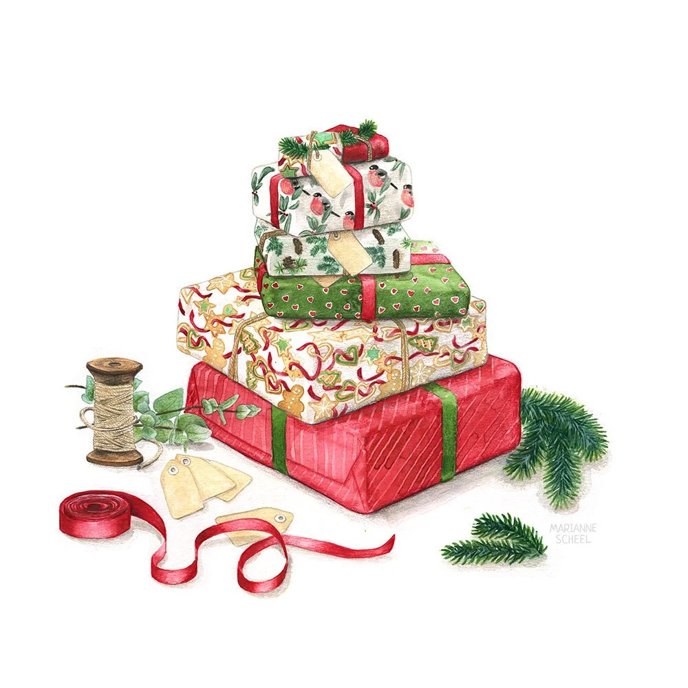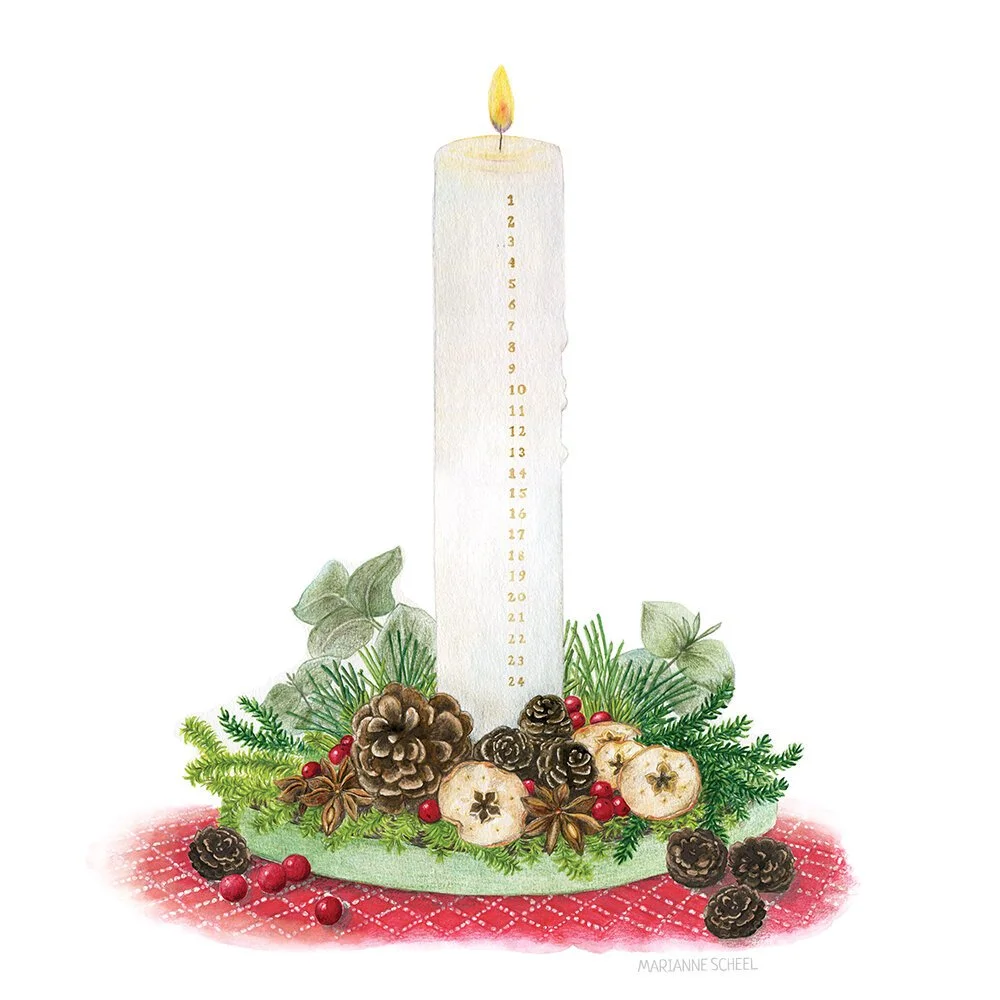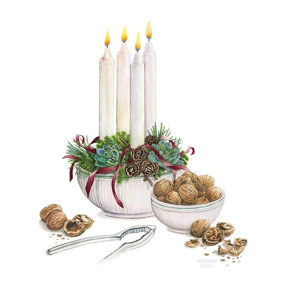 I was commissioned to create eight Christmas illustrations for a new greeting cards set. These illustrations were intended for use on a Christmas postcard set, which included a folder/packaging, as well as home decor products. The goal was to create realistic illustrations that represented Danish Christmas traditions and matched the 2018 Christmas collection. The illustrations were produced using watercolor and color pencils.